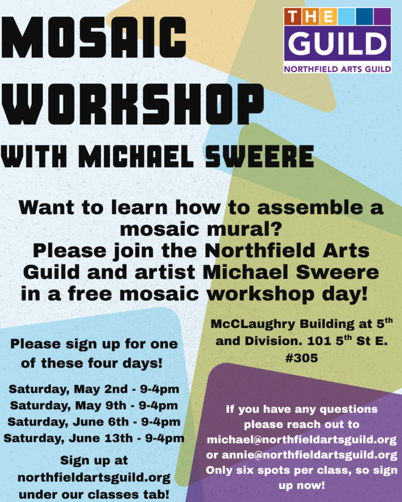 Join Artist Michael Sweere for a free all-day mosaic workshop! Michael has been chosen to design and construct the mural going in the new Northfield Ice Arena. Participants will spend the morning learning the differences in types of tile, mosaic materials, adhesives, and tools. After a hour lunch break, participants will come back and spend the the afternoon working on the actual mosaic mural that will eventually be installed in the new ice arena. Each class is meant as a single session.