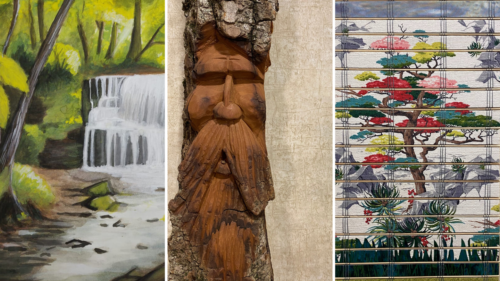 Joe Udelhofen brings the bark of cottonwood trees to life with his whimsical carvings, treated with linseed oil.